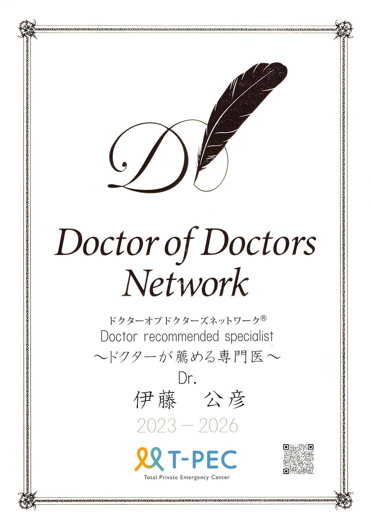 ドクターが薦める専門医とは、ティーペック株式会社が提供するサービス『ドクターオブドクターズネットワーク®』の特別顧問・評議員から推薦された医師の中から、下記の選考基準にもとづき、ドクターオブドクターズネットワーク®評議員会において全会一致で選考された医師を指します。